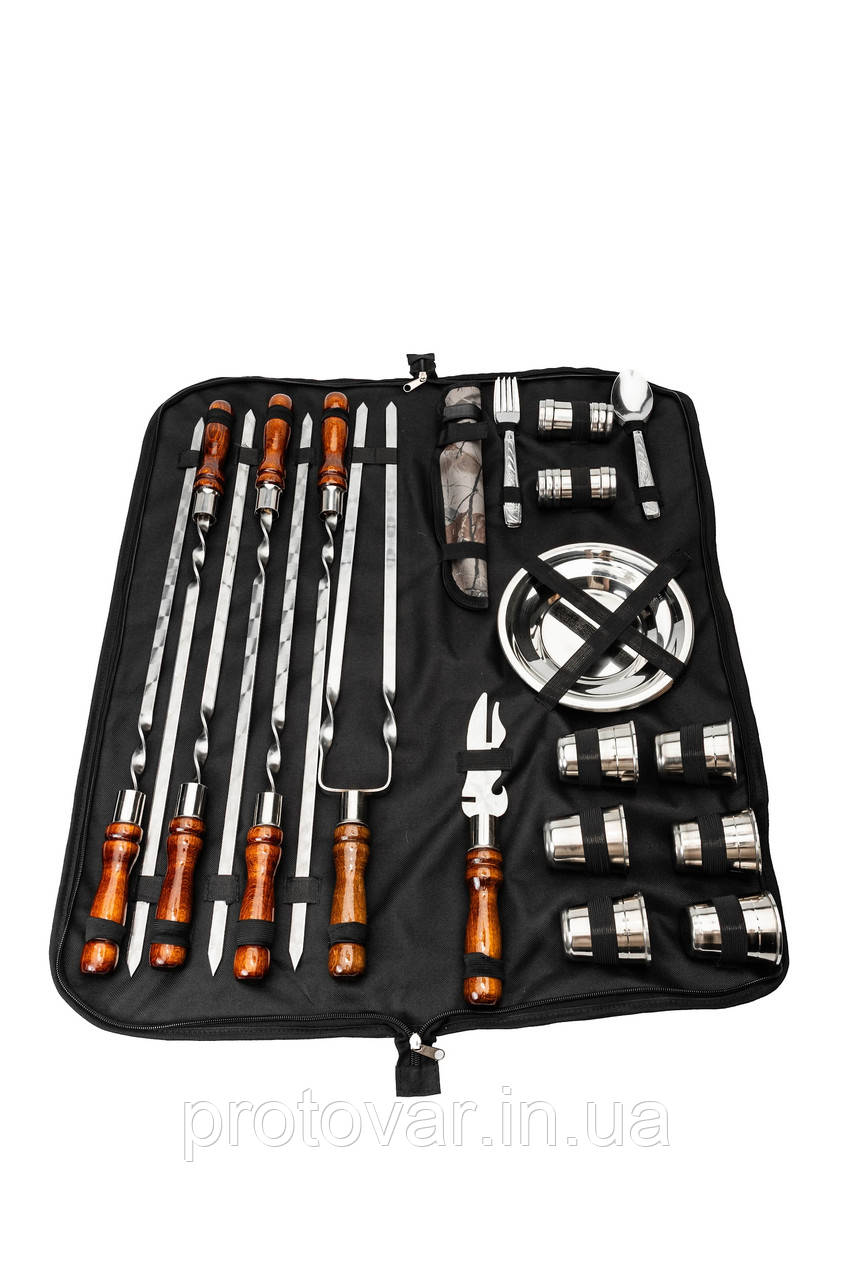 | Комплектація набору | 6 шампурів, 6 ложок, 6 вилок, 6 мисок, 6 чарок, вилка для зняття м'яса, чохол для ножа, ніж, подвійний шампур, 2 баночки для спецій, сумка |