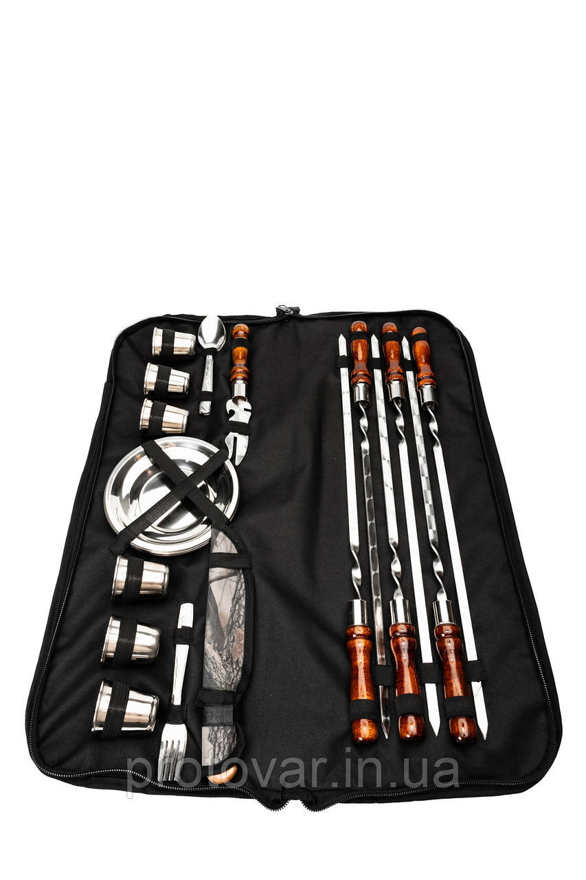 | Комплектація набору | 6 шампурів, 6 ложок, 6 вилок, 6 мисок, 6 чарок, вилка для зняття м'яса, чохол для ножа, ніж, сумка |